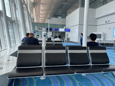 最初に、使用していないゲートに集まり、これからどのように手続き、検査が行われるかの説明がありました。ここではゲート「144」この番号は検査の結果待ちの場所も同じ番号が表示されていました。