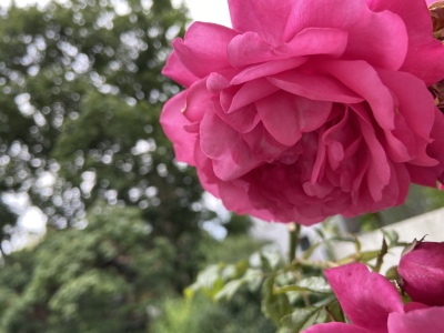 下の階から我が家のべランダに届くまで伸びたバラの花。